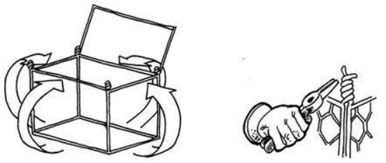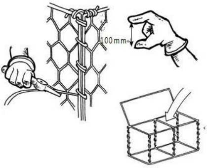 2、把每個(gè)旁邊面立起來(lái),組合成一個(gè)網(wǎng)箱狀。網(wǎng)箱的每一個(gè)外表都有較粗的邊絲,在網(wǎng)面的邊角把這些重合的粗邊絲相互擰在一起。這些擰在一起的邊絲在邊角和綁絲重合。